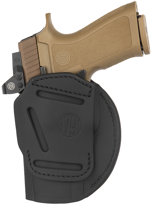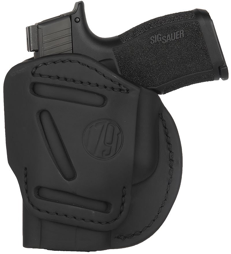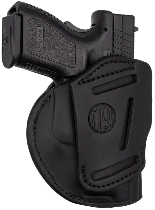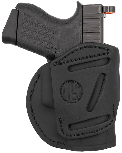 The 1791 Gunleather 4-Way is a multi-position leather holster compatible with compact pistols including Glock 26, Ruger LC9, S&W M&P Shield, and similar frames. It functions as both an inside-the-waistband (IWB) and outside-the-waistband (OWB) holster with vertical cant capability, allowing users to adjust carry position based on preference and situation. Constructed from stealth black leather with belt clip mounting and designed for right-hand draw.
