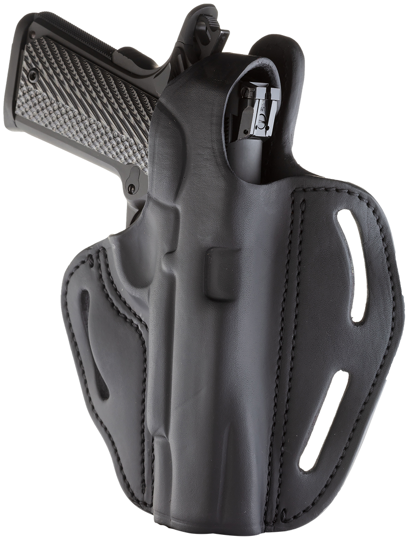 Right-hand outside-the-waistband leather belt slide holster designed to fit 4"-5" 1911 pistols. Features a thumb break retention strap and fits standard belts up to approximately 1.75" width. Constructed from premium leather with a stealth black finish.