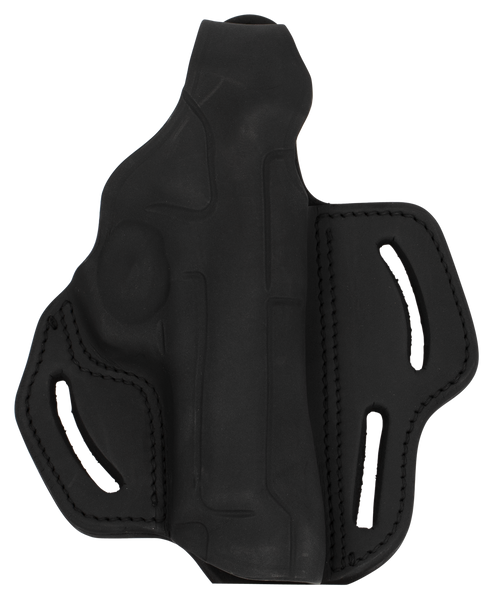 Right-hand OWB belt slide holster sized for mid-size pistols including Glock 17, S&W M&P Shield, and Springfield XD. Constructed from leather with dimensions of 11.0" length x 2.5" height and a 9.2" width, designed for comfortable all-day carry. Single-compartment design mounts securely via belt slide attachment.