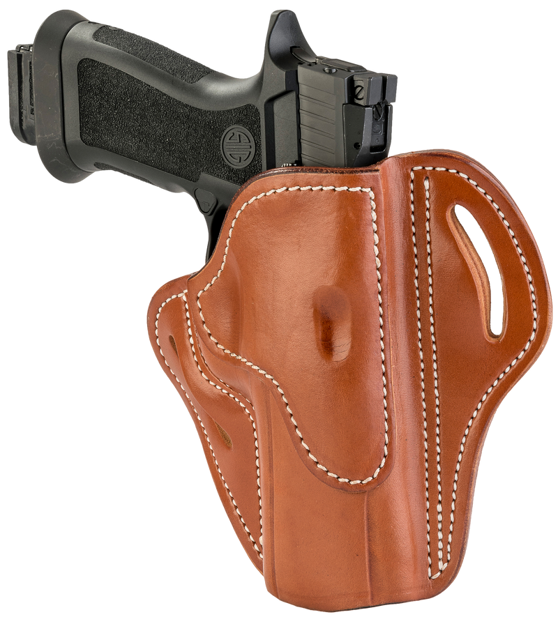 Outside-the-waistband belt slide holster made from leather, designed for right-hand carry. Compatible with Walther PPQ, Sig P320, Springfield XD-M, and similar mid-size pistols. Dimensions are 10.9" length x 2.6" height with a 9.3" width.