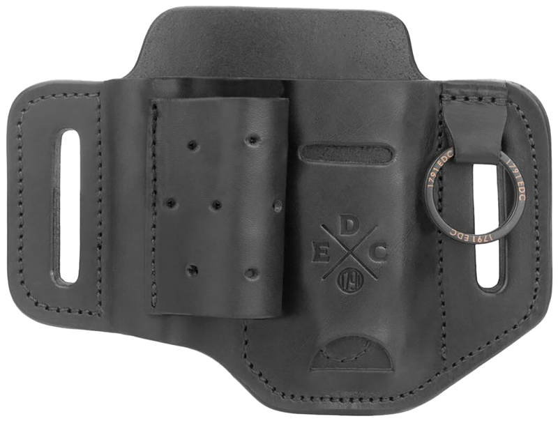 Ambidextrous outside-the-waistband (OWB) belt slide holster crafted from premium black leather. Designed for everyday carry (EDC) with heavy-duty construction and easy draw mechanics. Small size dimensions measure 9.0" L x 8.2" W x 1.9" H.