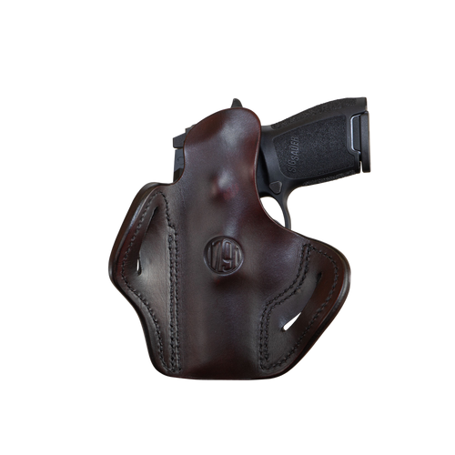 This right-hand OWB belt slide holster is designed for mid-size pistols including the Walther PPQ, Sig P320, and Springfield XD-M. Constructed from premium leather with Mossy Oak camo accents, it features an optic-ready design with dimensions of 9.3" length × 2.8" height × 9.1" width. The size 2.4 fits standard belt widths and provides secure retention for daily carry or range use.