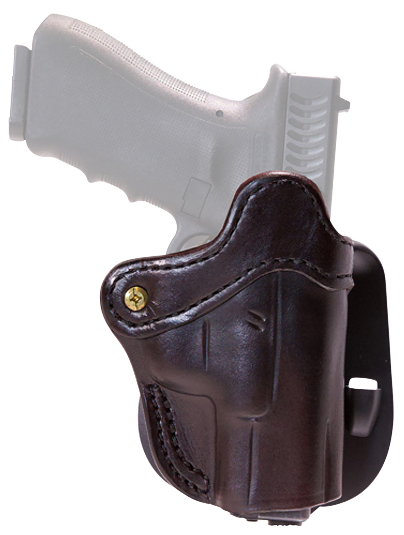 This is an outside-the-waistband (OWB) paddle holster designed for 1911-style pistols with 4-5" barrels, featuring an optic-ready design to accommodate mounted red dot sights. Constructed from premium leather in Signature Brown, it offers a secure fit with right-hand draw configuration and paddle-style belt attachment for quick on-and-off capability.