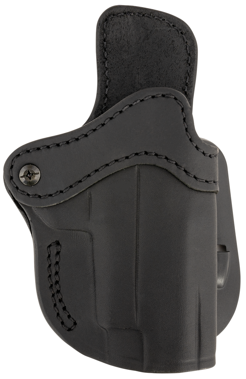 This is a right-hand, outside-the-waistband (OWB) paddle holster designed for optics-ready pistols. Made from full-grain leather in Signature Brown, it accommodates Glock 17 and Walther PPQ firearms. The holster measures 9.3" length × 9.0" width × 2.5" height and provides secure retention with a paddle mounting system.