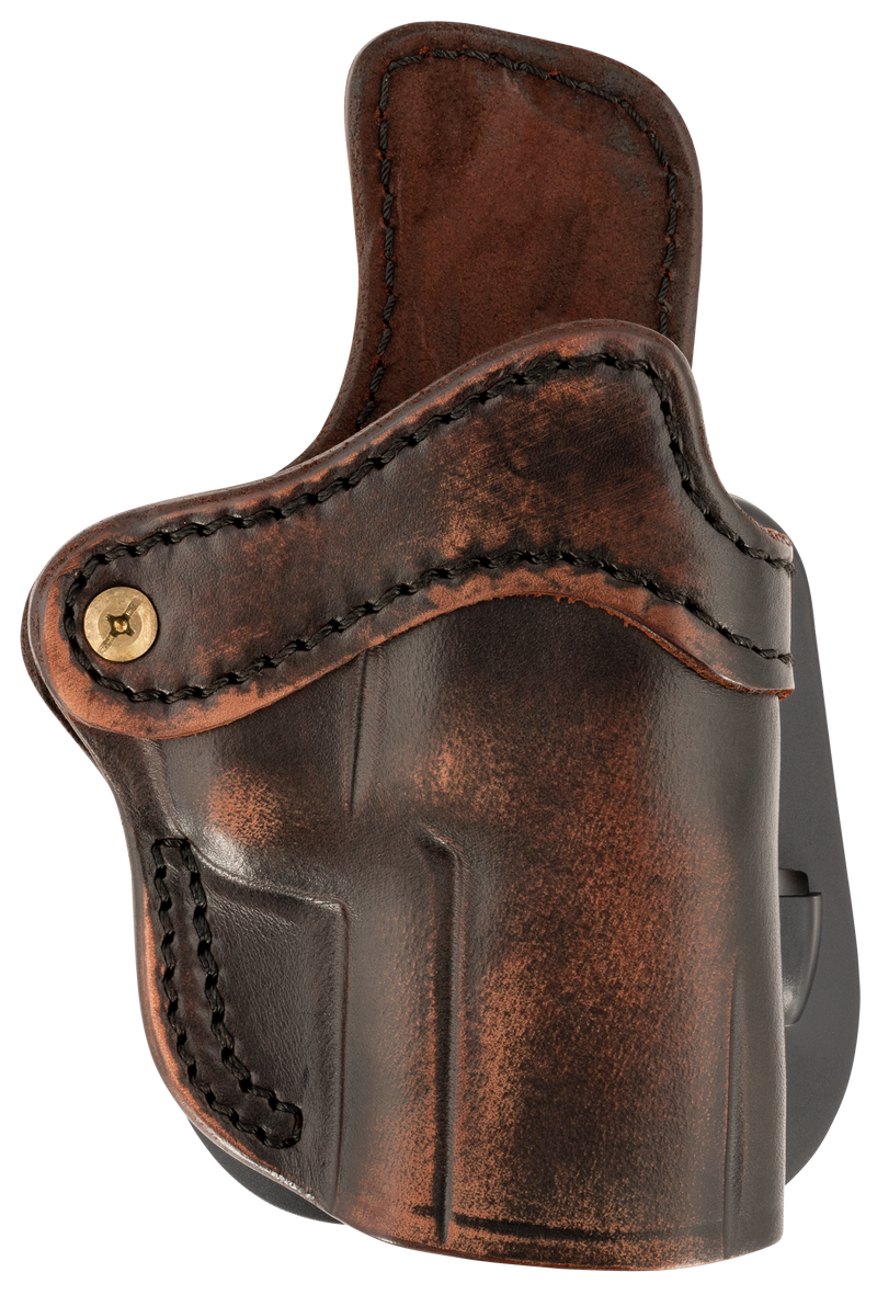 Right-hand OWB paddle holster designed for FN 509 and H&K VP9SK pistols with optic ready capability. Constructed from vintage leather with a 2.4S size profile and paddle mount system for secure, comfortable carry.