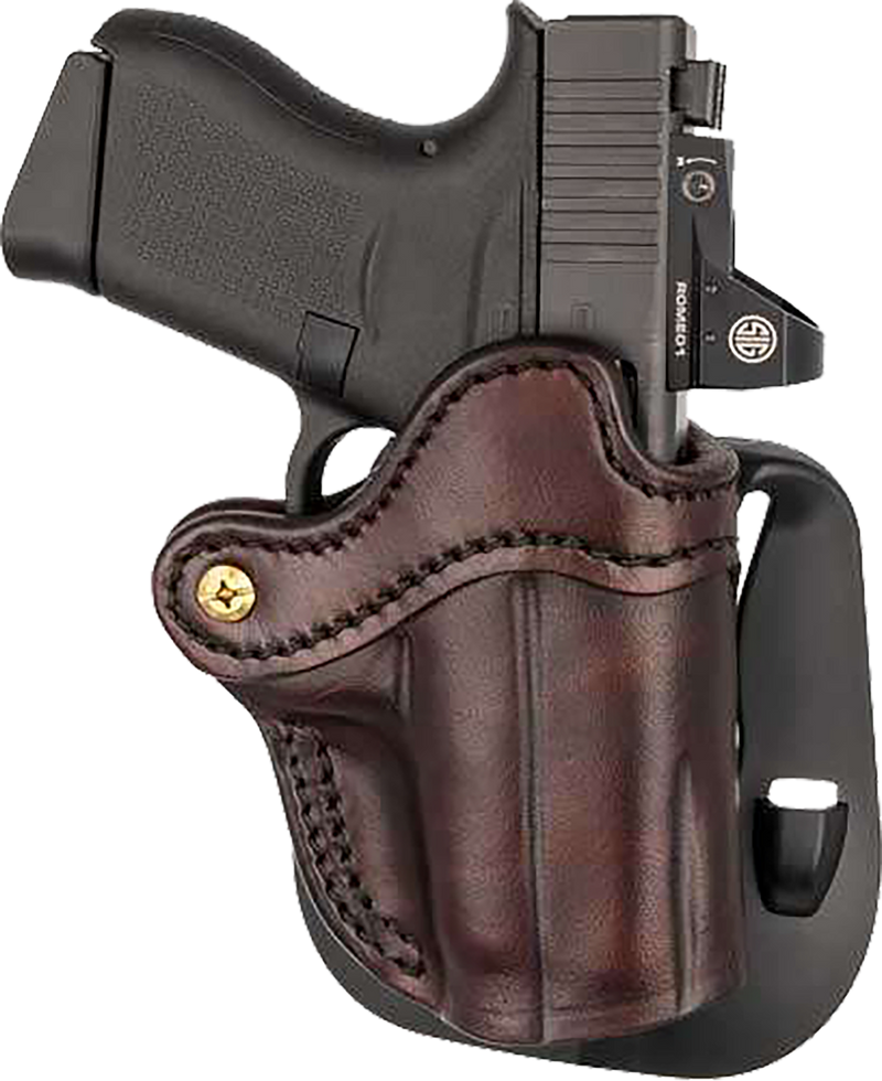 This is an outside-the-waistband (OWB) paddle holster designed for compact and subcompact pistols with 2.50-3" barrels, including models like the Sig P365. Constructed from premium signature brown leather, it features an optics-ready design and is configured for right-hand carry. The paddle mount provides secure attachment and quick removal from the belt.