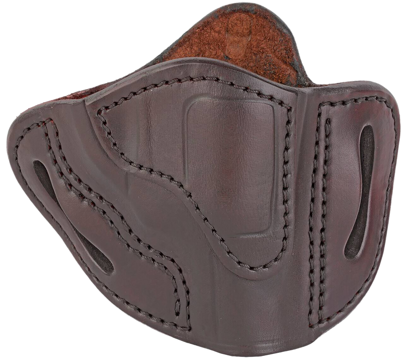 Outside-the-waistband belt slide holster designed for S&W J Frame, Ruger LCR, and similar small-frame revolvers. Constructed from full-grain leather with a right-hand draw configuration and accommodates belts up to 1.75" wide. Dimensions are 10.9" length by 2.5" height.