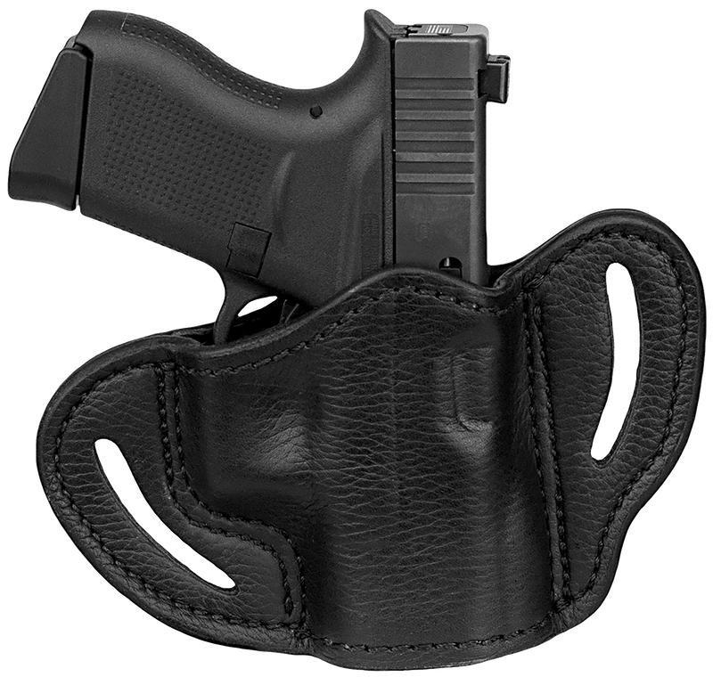 Right-hand outside-the-waistband (OWB) belt slide holster crafted from leather, designed for compact pistols including Sig P365, Springfield Hellcat, and Glock 42. Features Size C dimensions (9.8" L x 3.1" H x 7.3" W) and secure belt slide mounting system for everyday carry.