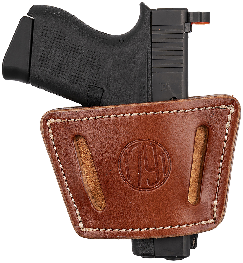 This universal holster from 1791 Gunleather is designed for most small to mid-frame semi-automatic pistols and features an ambidextrous belt clip mount suitable for both inside and outside waistband carry. Crafted from classic brown leather with dimensions of 6.0" L × 5.6" W × 1.1" H, it provides a secure and durable option for concealed or open carry applications.