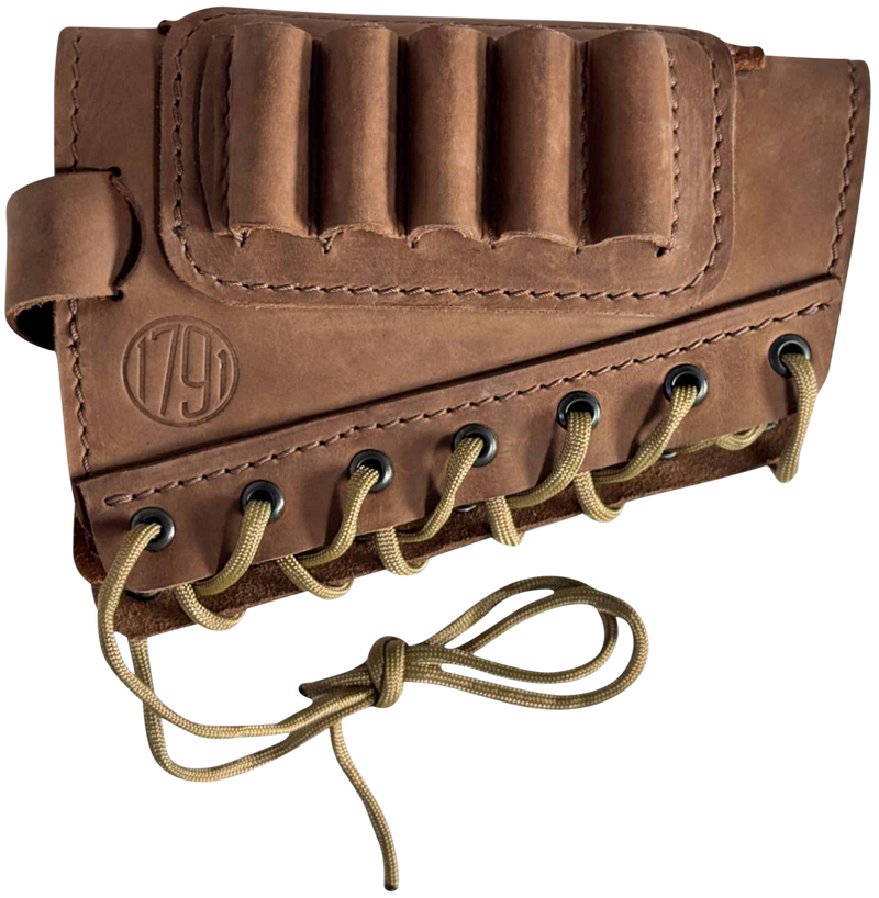 Leather ammunition holder designed to attach to shotgun buttstock via a "Creep Stop" strap mount. Measures 10.9" x 9.2" x 3.1" and holds 12-gauge shotgun shells. Constructed from quality leather and part of 1791 Gunleather's Hunt series.