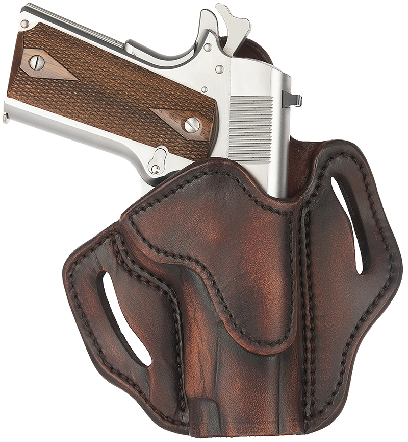 This right-hand outside waistband belt holster is designed for 4-5 inch 1911 pistols with or without optics installed, featuring vintage leather construction with a matte finish. The holster offers excellent retention and a comfortable fit for barrel lengths from 3.5 to 4.25 inches. Best suited for 1911s with no or half rails.