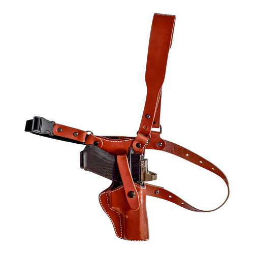 Open top belt slide holster designed for slim 4" firearms including Glock 17, S&W M&P Shield, and Springfield XD9 models. Features vintage leather construction with optic-ready design and right-hand draw orientation. Dimensions are 9.3" L x 2.5" H with excellent retention for concealed carry.