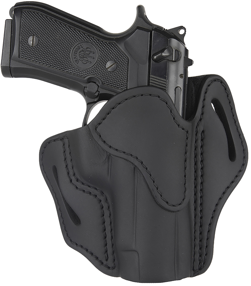 Open-top, multi-fit belt holster designed for mid to full-size firearms with rails, including Glock 17, S&W M&P Shield, and 1911s with rails up to 5" in length. Features optic-ready design, right-hand draw, and premium leather construction. Dimensions are 9.3" length x 2.9" height with 9.1" width for secure belt-slide mounting.