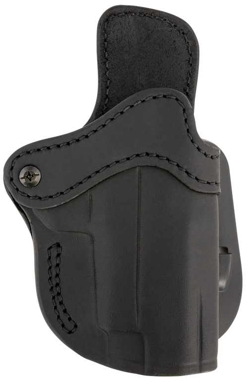 This open-top, multi-fit belt slide holster is designed for larger framed firearms with rails, accommodating full-size 1911s with full rails up to 5" in length and a wide range of pistols including Glock and Ruger models. The BH2.3 features vintage leather construction with optic-ready design and right-hand draw orientation. Dimensions are 9.3" length × 2.9" height with a 9.0" width.