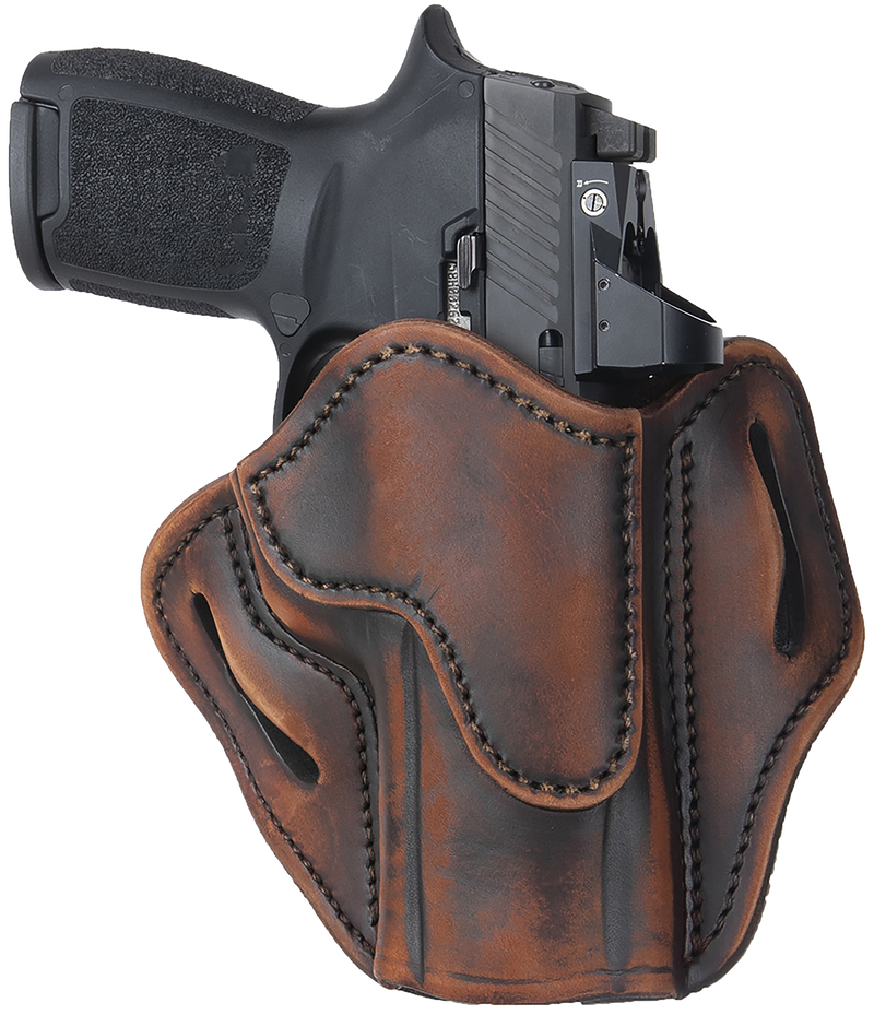 Open-top, multi-fit belt slide holster designed for full-frame firearms 4" to 5" in length, including Walther PPQ, Sig P320, and Springfield XD-M. Features excellent retention with a smooth draw and is optic-ready compatible. Constructed from premium vintage leather with right-hand orientation.