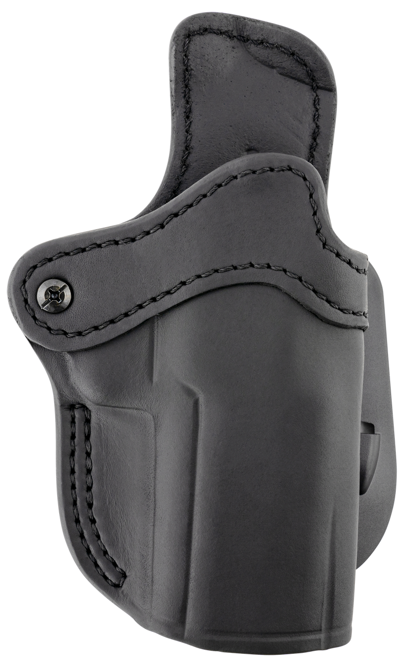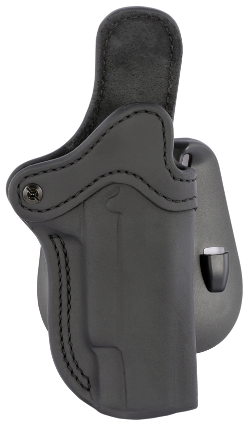 Outside waistband paddle holster designed for optics-ready carry on pistols including Walther PPQ, Sig P320, and Springfield XD-M. Constructed from leather with a sweat guard to protect the shooter from the firearm and its controls. Right-hand draw configuration.