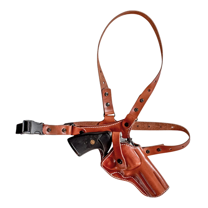 The 1791 Pathfinder chest holster is constructed from American steerhide and designed for S&W K and L frame revolvers. It features a right-hand strap mount configuration and is built to provide secure, comfortable carry in brown leather.