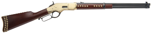 The Taylor's and Company 1866 Carbine is a lever-action rifle chambered in 45 Colt with a 19" barrel and 10+1 capacity. Features a blued finish, walnut stock and grip, brass receiver, dovetail rear and blade front fixed sights, and saddle ring. This period-correct reproduction weighs 7.48 lbs with an overall length of 37.87" and 1-in-16" rate of twist.
