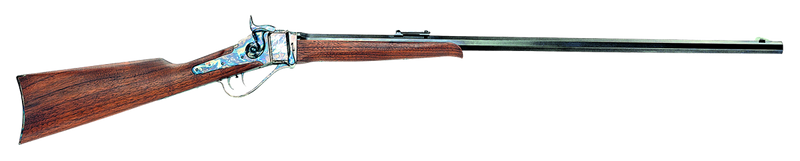 Single-shot lever-action rifle chambered in .45-70 Government with a 32-inch octagonal barrel and case-hardened steel receiver. Features a walnut stock and grip, fixed buckhorn rear and blade front sights, and weighs 10.6 lbs with an overall length of 49 inches. This reproduction of the classic 1874 Sharps is a quality hunting and target rifle.