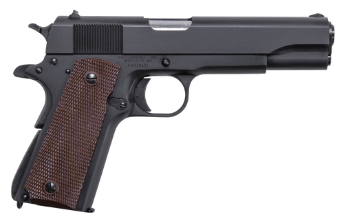 Semi-automatic single-action pistol chambered in 45 ACP with a 4.25" barrel and 7+1 capacity. Features a matte black carbon steel slide and frame, brown checkered polymer grips, and GI-spec sights with blade front and drift-adjustable rear. Weighs approximately 35-39 oz and is 100% made in the USA.