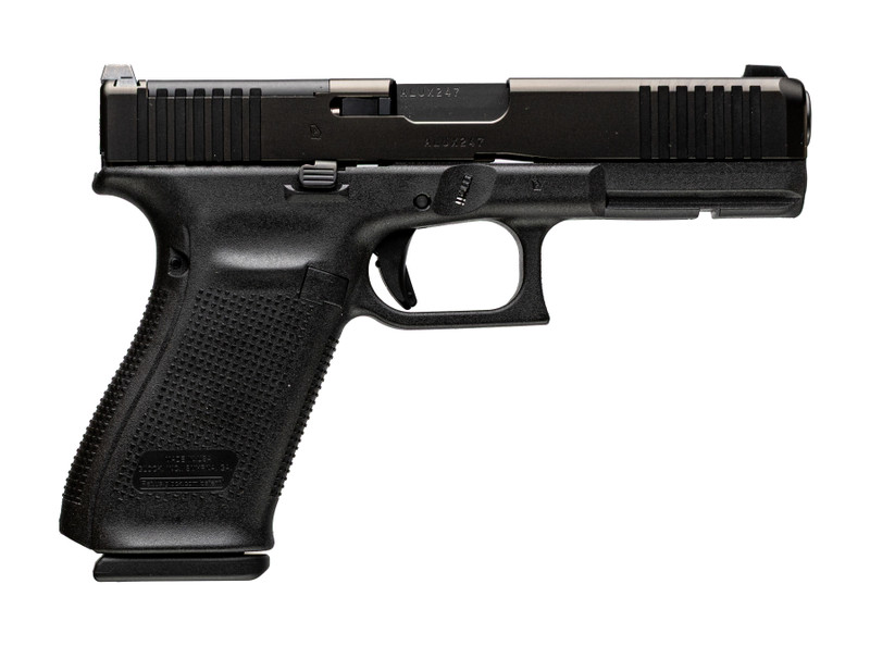 The Glock 21 V MOS is a full-size, striker-fired semi-automatic pistol chambered in .45 Auto with a 13+1 round capacity. It features a Glock Marksman barrel, night sights front and rear, ambidextrous slide stop levers, and a flared magwell. This law enforcement model includes interchangeable backstraps and comes with three magazines.