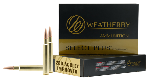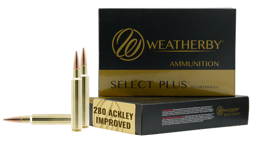 Weatherby 280 Ackley Improved ammunition loaded with 150-grain Sierra Tipped Gameking bullets. The 280 AI cartridge features a 40-degree shoulder to maximize powder capacity and deliver superior ballistics and velocity compared to the standard .280 Remington. Supplied in 20-round boxes.