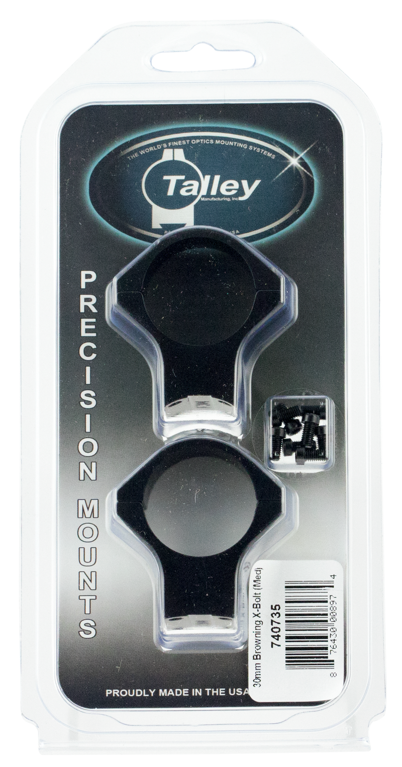 Talley lightweight alloy scope mount and ring combination designed for Browning X-Bolt rifles with 30mm tube diameter and medium ring height. Features a 2-piece integrated base and ring system with matte black hardcoat anodized finish, machined from 6061 aluminum alloy and manufactured in the USA.