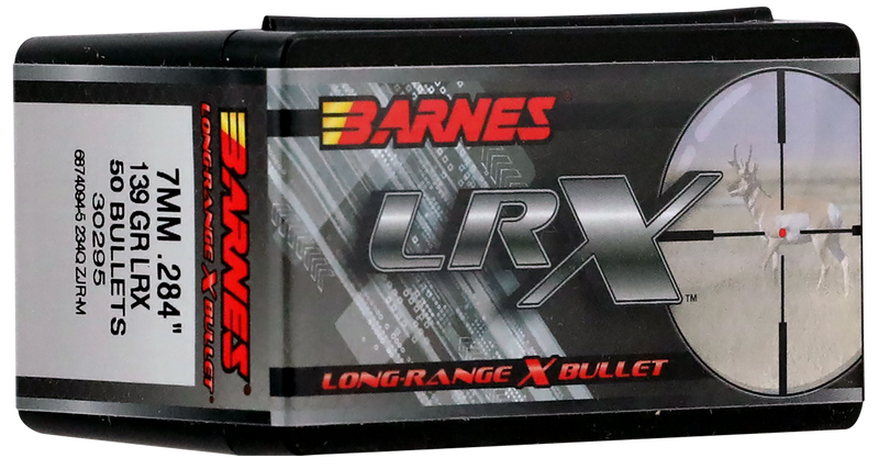 Barnes LRX Long Range X bullets are copper-constructed, lead-free reloading bullets designed for long-range precision shooting in 7mm/.284" caliber. Each box contains 50 boat tail bullets weighing 139 grains with a polymer tip and 1.384" overall length. California Prop 65 certified nonlead ammunition component.