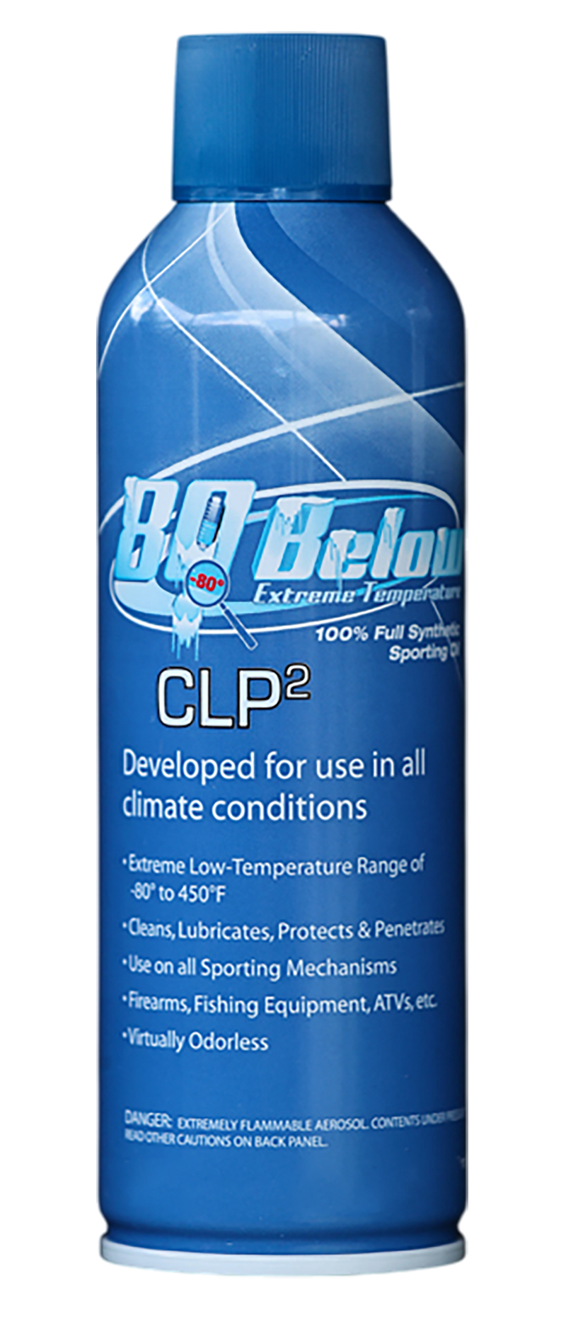 80 Below CLP2 is a synthetic cleaning, lubricating, and protective aerosol designed for firearms and fishing reels. This 12-pack contains 3oz aerosol cans suitable for routine maintenance and protection of metal surfaces. The product is hazmat-regulated for both ground and air shipping.