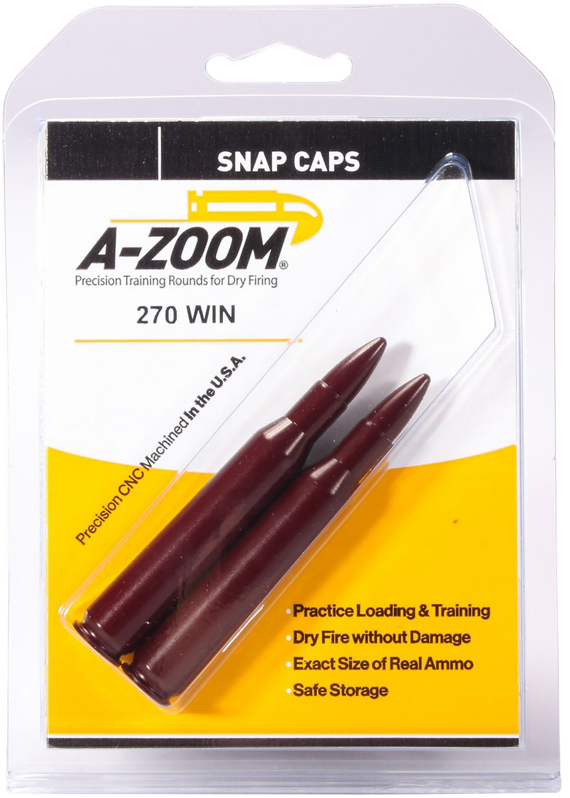 A-Zoom snap caps are aluminum dummy rounds designed for safe dry-fire training, storage, and function testing of .270 Winchester rifles. These snap caps eliminate unnecessary wear on firing pins and are ideal for practice and firearm maintenance without live ammunition.