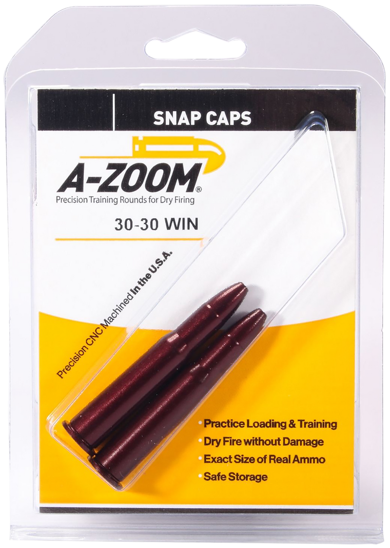 A-Zoom snap caps are dummy rounds designed for safe firearm training, storage, and function testing in .30-30 Winchester caliber. Constructed from tough solid aluminum, these snap caps eliminate unnecessary wear on firing pins during dry fire practice. Sold as a 2-pack.