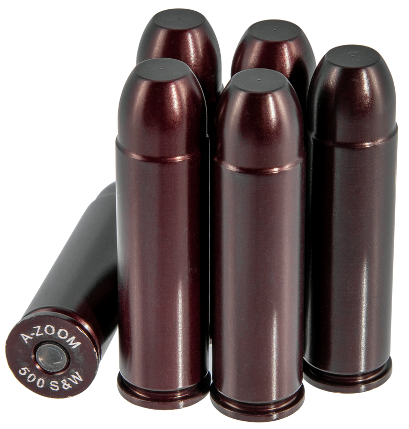 A-Zoom snap caps are dummy rounds designed for safe dry-fire practice and function testing in .500 S&W Magnum revolvers. Made from tough solid aluminum construction, these training rounds eliminate unnecessary wear on firearm firing pins and are ideal for quick-draw practice and storage testing.