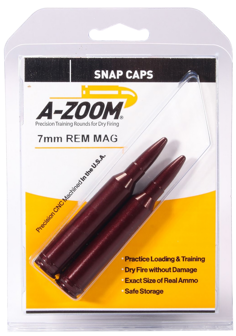A-Zoom snap caps are aluminum dummy rounds designed for safe dry firing, trigger adjustment, and function testing without damaging the firing pin. Manufactured by Pachmayr, these are ideal for training, storage, and bolt cycling practice on 7mm Remington Magnum rifles.