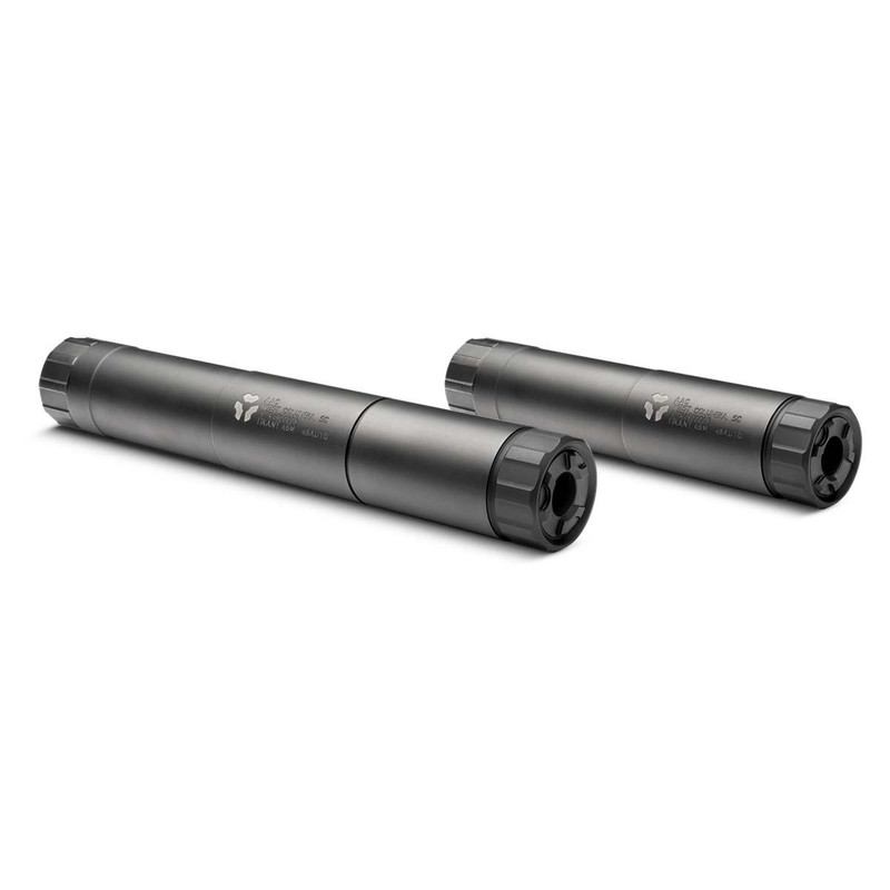 The Ti-Rant 45M is a modular suppressor for .45 ACP that converts tool-free between a 9-inch full-length configuration and a 6.9-inch compact design. Constructed from Grade 9 titanium with a removable baffle stack for easy cleaning and maintenance, it features a 1.4-inch diameter and achieves 31 dB of noise reduction. The suppressor uses a 5/8x24 direct thread attachment and weighs 11 oz in full length or 8 oz in compact mode.