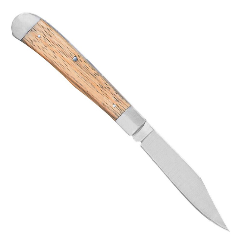 This multi-tool knife features a classic trapper pattern with a detachable fork blade alongside the primary 3-1/4" stainless steel blade hardened to 60 HRC. The zebrawood hardwood handles and stainless steel bolsters provide durability and traditional aesthetics suitable for outdoor and everyday use. Closed length is 4.125 inches with a lock back mechanism.