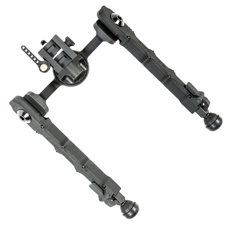 The Accu-Tac FC-5 G2 is an F-Class bipod constructed from black hardcoat anodized aluminum with steel feet, designed for precision rifle shooting. It features a Picatinny rail attachment, 6"-10.60" vertical adjustment range, and lockable leg positions for stable shooting support. The bipod also offers cant and pan functionality for enhanced aiming adjustment.