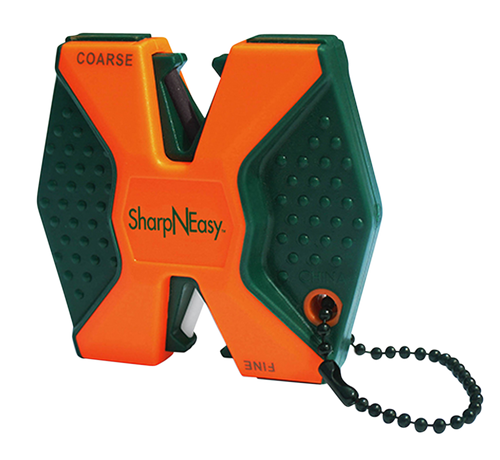 Hand-held tungsten carbide knife and tool sharpener with a full finger guard, designed for quick blade sharpening and maintenance. Features a plastic handle for comfortable grip and portable use in the field or at home.