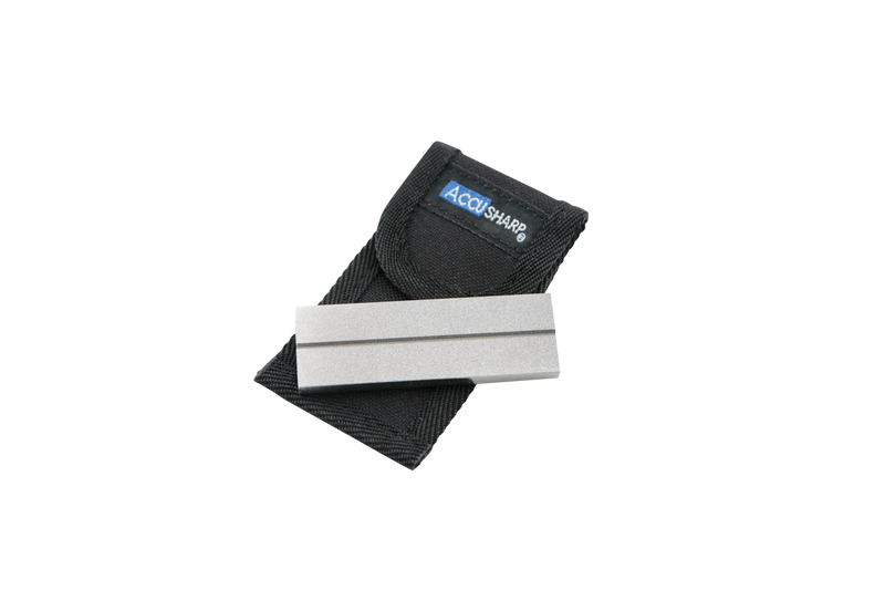 The AccuSharp Pocket Stone is a dual-grit diamond sharpener featuring both fine and coarse surfaces for versatile blade maintenance. Compact dimensions (8.8" x 3.9" x 0.7") make it ideal for field use or everyday carry. Comes with a nylon sheath for convenient storage and protection.