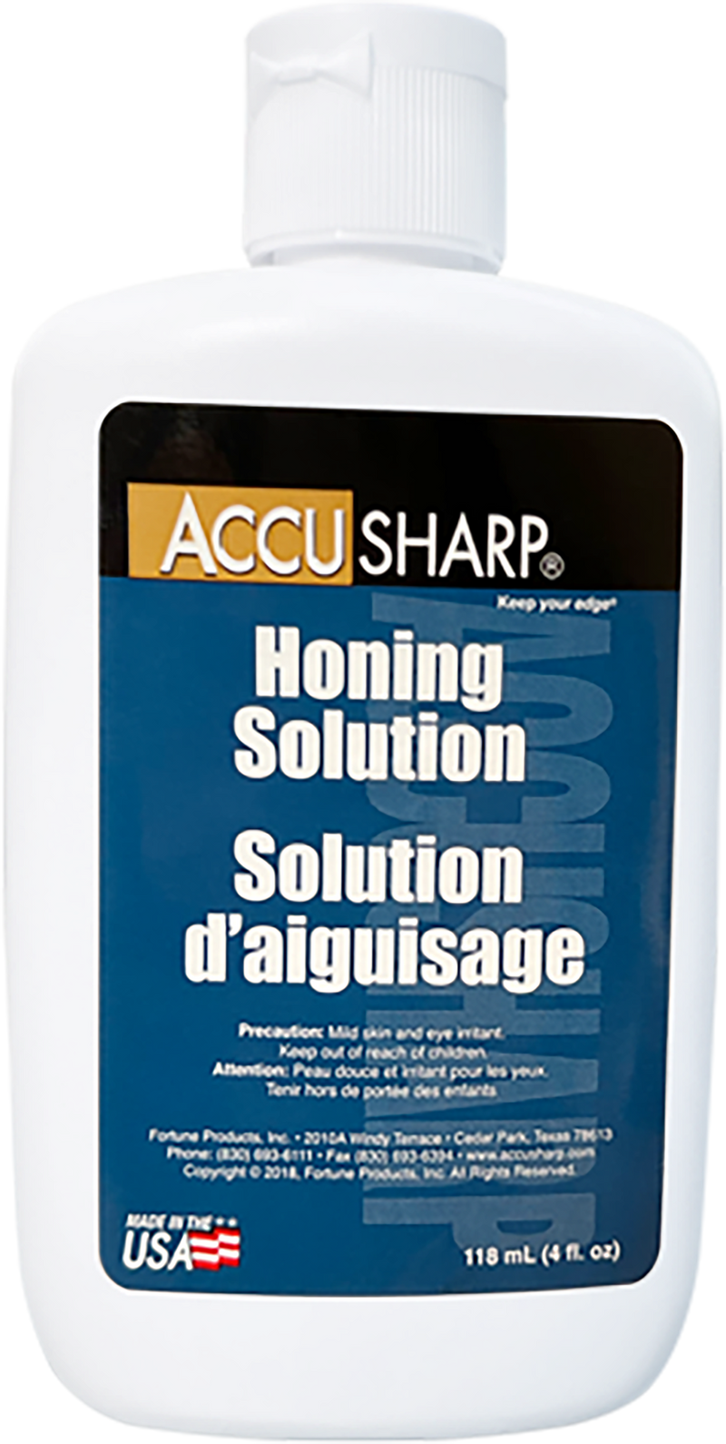 This 4 oz bottle of AccuSharp honing solution is designed for maintaining and sharpening knife edges. The solution aids in the honing process to keep blades in optimal cutting condition. It is a liquid accessory product intended for use with knife sharpening systems.
