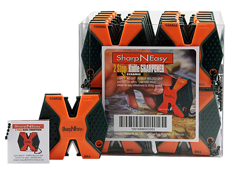 The AccuSharp SharpNEasy 335CD is a compact, hand-held blade sharpener featuring a 2-step design with both coarse and fine ceramic stone surfaces for versatile sharpening. The lightweight plastic handle (black and orange) makes it portable and easy to grip. Designed to sharpen and maintain blade edges on knives and similar cutting tools.