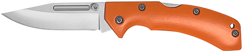 This AccuSharp 712C is a lockback folding knife featuring a 3" stainless steel clip point blade with a plain edge and blaze orange G10 handle. The knife has an overall length of 8" when closed and weighs 3.84 oz, making it a compact carry option. It includes an Allen wrench for maintenance and adjustment.