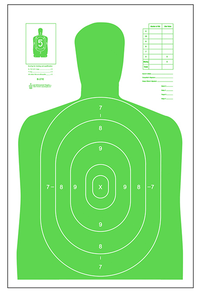 This is a qualification silhouette paper target measuring 23" x 35" with fluorescent green and white coloring for high visibility at the range. The target comes in a box of 100 and features a B27E silhouette design cut off below ring 7, designed for hanging-style mounting on target stands.