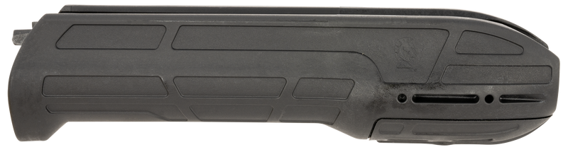 Black polymer forend designed for Mossberg 500/590 and Maverick 88 shotguns. Features a concealed 2" Picatinny rail for mounting accessories. Dimensions: 11.2" length × 3.2" width × 3.0" height.