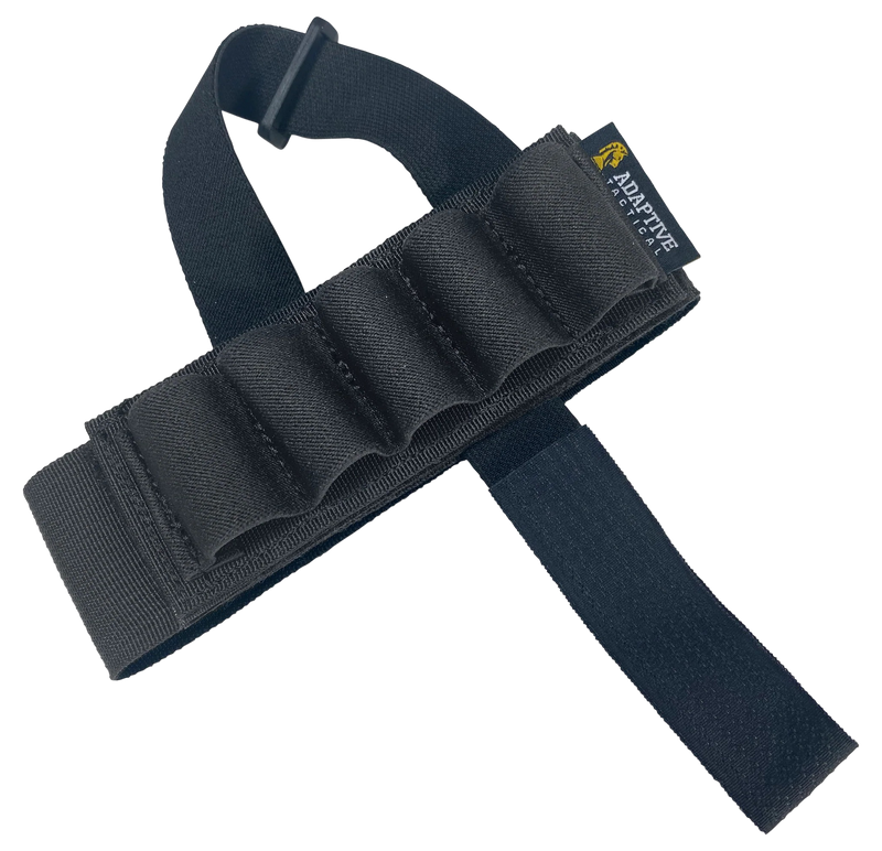This stock-mounted shell carrier holds up to 5 shotshells and attaches directly to adjustable shotgun stocks. Constructed from black nylon with non-slip loops to secure shells in place, it provides quick access to ammunition during shooting.