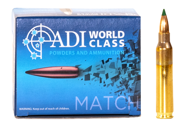ADI World Class Ammunition Match-grade 223 Remington centerfire rifle rounds loaded with 55 grain Sierra BlitzKing boat-tail projectiles in brass cases. This ammunition delivers precision performance in a 20-round box configuration, suitable for target shooting and match applications.
