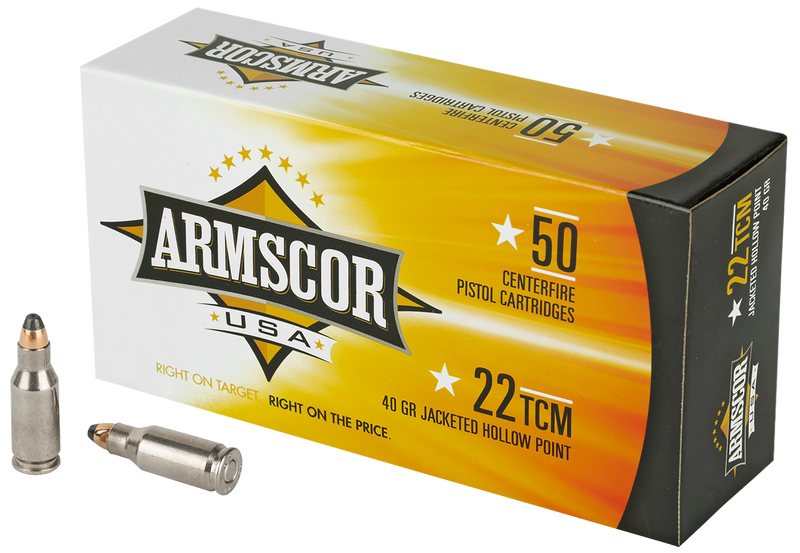 Armscor 22 TCM 40-grain Jacketed Hollow Point ammunition loaded to approximately 1875-2050 fps muzzle velocity with 312 ft-lbs of energy. This brass-cased, boxer-primed, non-corrosive ammunition is suitable for personal protection and target shooting applications. Sold in 50-round boxes with 20 boxes per case.