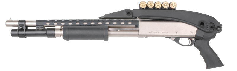This is a top-folding shotgun stock manufactured from glass-reinforced polymer with all-weather reinforcement. It is compatible with Mossberg, Remington 870, and Winchester 12 and 20 gauge pump shotguns. The stock features a pistol grip, textured finish, and dimensions of 15.6" length x 7.6" width x 3.0" height.