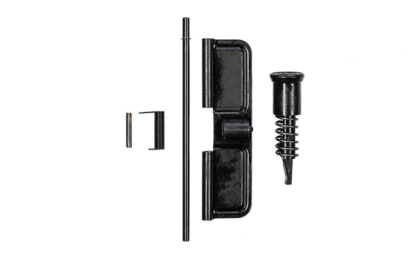 This upper parts kit contains all necessary components to assemble an AR15 upper receiver, including forward assist assembly, forward assist spring, forward assist roll pin, ejection port cover door, ejection port cover rod with c-clip, and ejection port cover spring. Features a durable anodized black finish. Compatible with standard AR15 platforms.