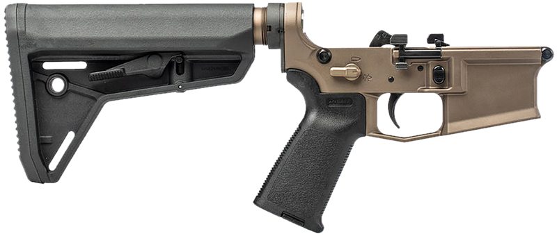 Semi-automatic complete lower receiver chambered in 5.56 NATO/.223 Remington with M4E1 PRO ambidextrous controls for both left and right-handed shooters. Includes Kodiak Brown anodized finish, Magpul MOE grip, Magpul MOE SL carbine stock, EZ takedown/pivot pins, and Aero Precision enhanced buffer tube.