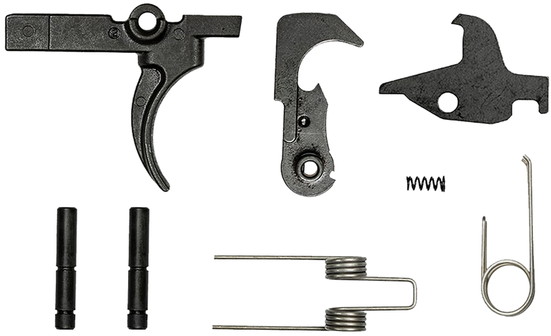Mil-spec fire control group kit for AR-15 and AR-10 platforms with curved trigger. This complete kit includes hammer, trigger, disconnector, springs, and pins for quick installation. Dimensions: 5.0" L x 3.1" W x 0.9" H.